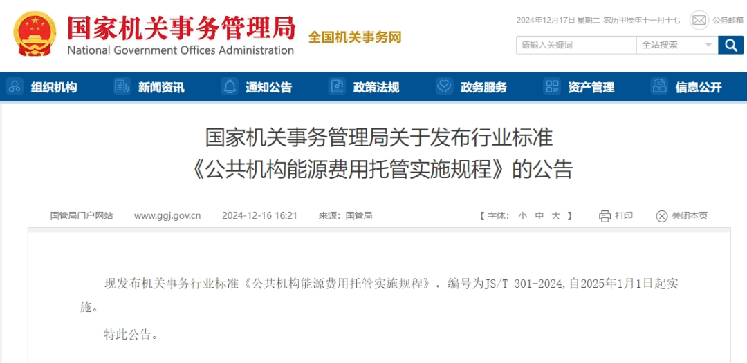 12月16日,國家機關(guān)事務(wù)管理局發(fā)布行業(yè)標準《公共機構(gòu)能源費用托管實施規(guī)程》(下稱“規(guī)程”),編號為JS/T 301-2024。該標準將于2025年1月1日起正式實施。《規(guī)程》規(guī)定了公共機構(gòu)能源費用托管實施涉及的前期評估、組織采購、合同簽訂、組織實施、項目調(diào)整、效果評估、資產(chǎn)管理和費用結(jié)算的管理要求,適用于公共機構(gòu)能源費用
